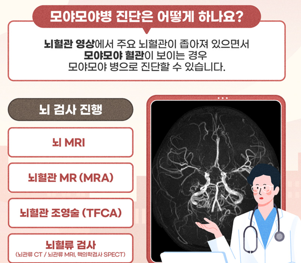 모야모야병은 증상만으로 진단하기 어렵기 때문에 영상 검사가 필수적입니다. 주요 진단 방법은 다음과 같습니다:
