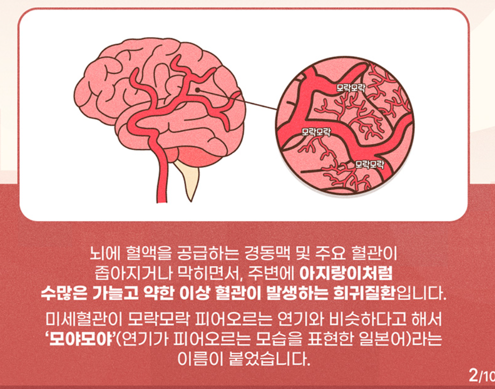 모야모야병은 뇌혈관이 점차 좁아지거나 막히면서 뇌에 혈액 공급이 원활하지 않게 되는 희귀 질환입니다. 이 병은 주로 뇌의 내경동맥이나 그 주변 혈관에 영향을 미치며, 혈관이 막히는 대신 비정상적인 미세 혈관망이 형성되는 것이 특징입니다. 이러한 혈관망은 마치 연기처럼 보인다고 해서 일본어로 "모야모야(연기)"라는 이름이 붙여졌습니다.