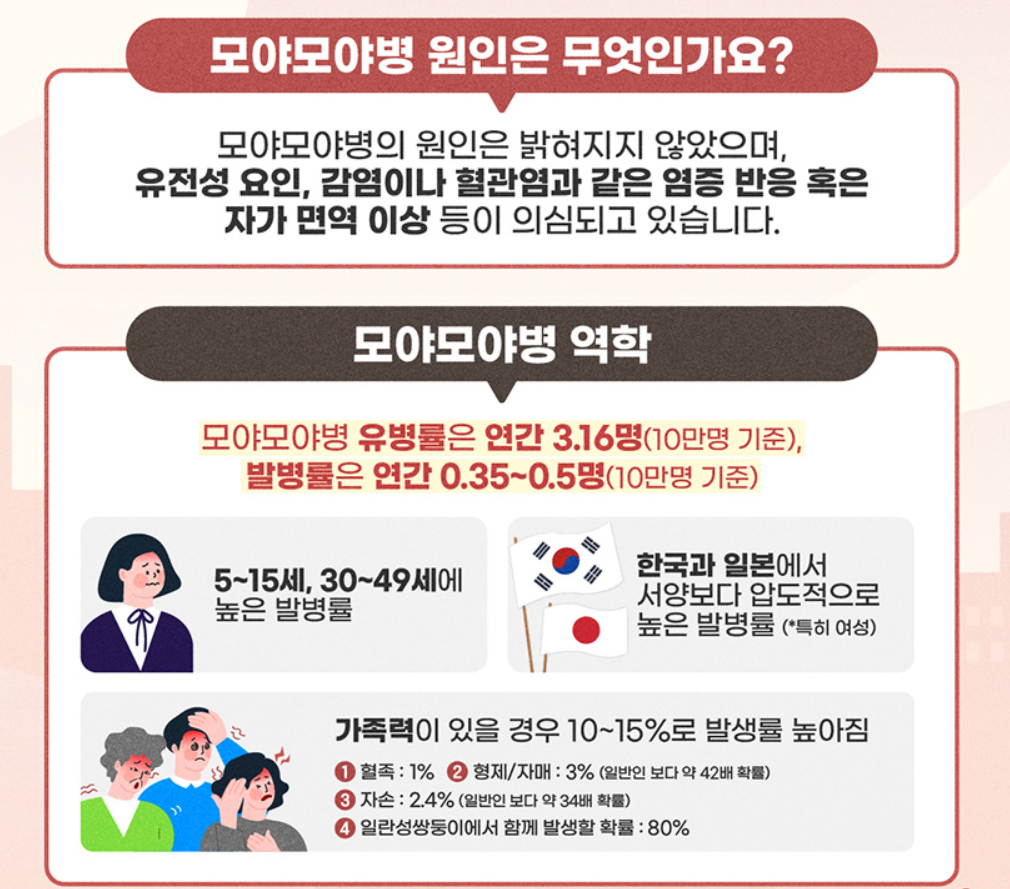 - 연관 질환: 모야모야병은 다운증후군, 신경섬유종증 같은 유전 질환과 함께 나타날 수 있어 유전적 연관성을 시사합니다.